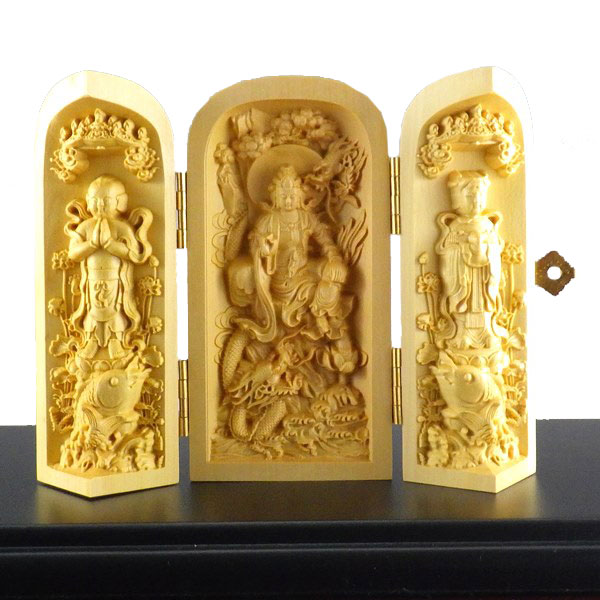 龍上観音様の脇侍は、 ・(龍上観音に向かって右側)「従者童子(じゅうしゃどうじ)」—龍寿菩薩を本地に持つ経営の神とされています ・(龍上観音に向かって左側)「善財童子(ぜんざいどうじ)」—善行と精進の気を守護してくれると言われています 龍上観音様の見事な厨子を、玄関や神棚などにお飾りいただき、家内安全や災厄除けの開運縁起物として、また吉祥を願うプレゼントとしてもお勧め致します。