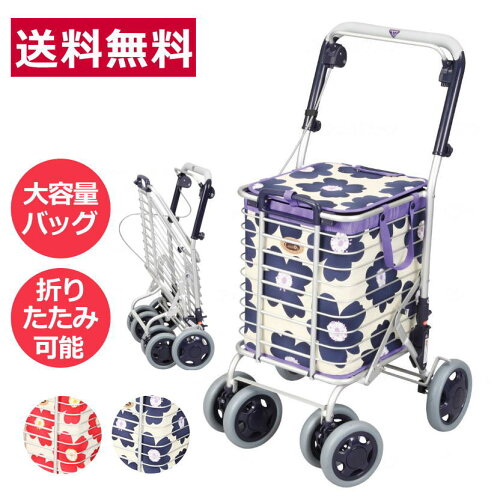【人気商品】おしゃれな花柄が人気 ショッピングバッグ付 [アルミワイヤーカート 花柄] A-0245 ユーバ産業【送料無料】4輪 シルバーカート 軽量 買いものカート 高齢者 手押し車